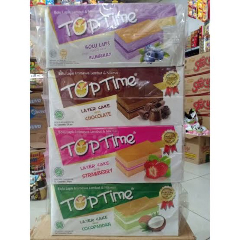 Bolu Lapis Top Time , Bolu lapis istimewa lembut & nikmat. Istimewa karena terbuat dari bahan pilihan berkualitas yang diproses secara modern oleh para ahli. 1 kotak isi 24 pcs