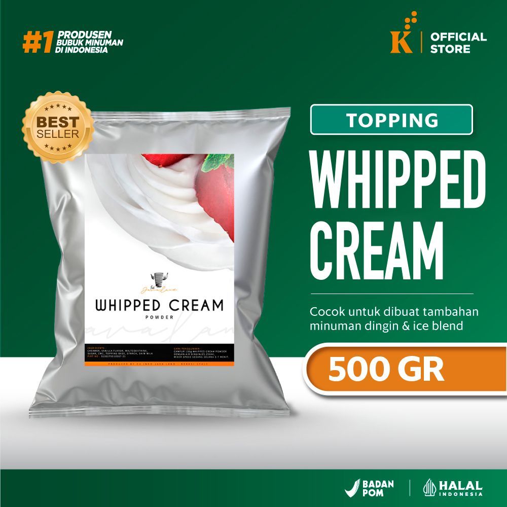 Whipped adalah Topping minuman krim kocok dalam bentuk bubuk yang sering digunakan untuk menghias kue atau menambah tekstur lembut pada minuman