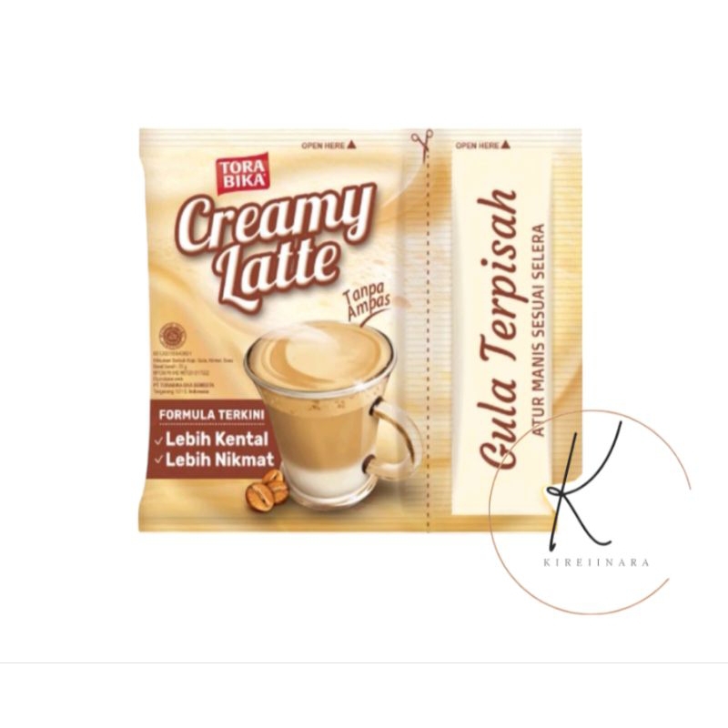Torabika Creamy Latte kopi instan super Creamy dengan gula terpisah. Perpaduan antara campuran kopi instan yg wangi dengan creamer manis dan lezat yang memberikan keistimewaan untuk menikmati rasa kopi. Cita rasa kopi latte yang super creamy dengan gula yg bisa diatur.