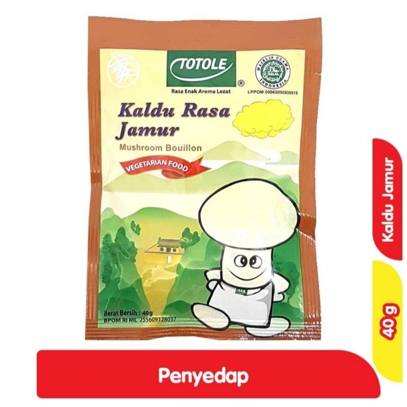 TOTOLE Kaldu Rasa Jamur 40 g adalah bumbu penyedap masakan yang membuat cita rasa masakan anda akan menjadi semakin lebih lezat dan gurih. Cocok untuk yang vegetarian karena tidak mengandung bahan-bahan hewani. Tersedia dalam kemasan sachet isi 40 g.
