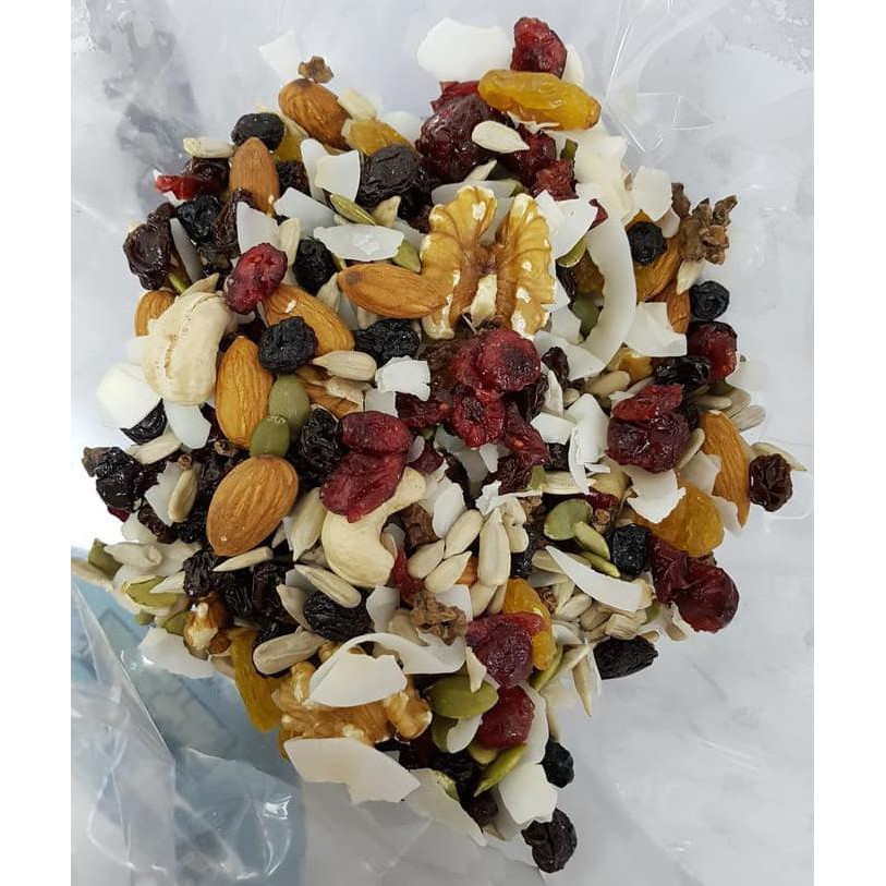 Ingredients : Cranberry, Raisin, Golden Raisin, Blueberry, Almond, Cashew, Walnut, Pumpkin Seed, Sunflower Seed, Sweet Nibs, Coconut Flakes.