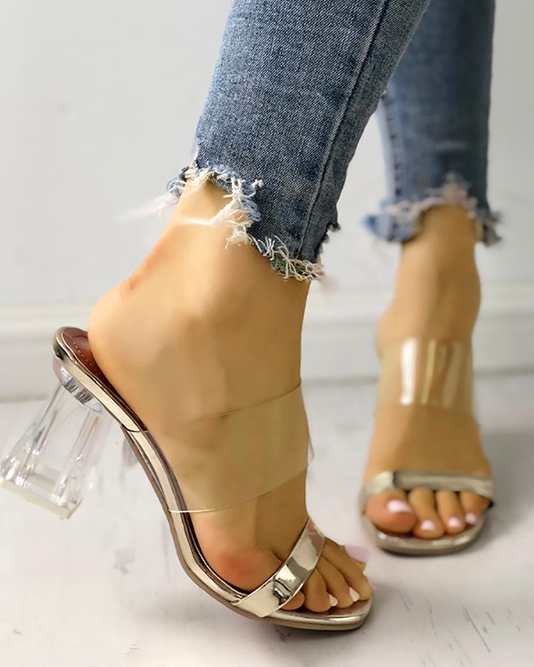 Transparent Open Toe Chunky Heeled Sandals, Gold