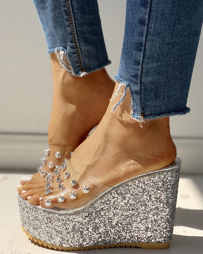 Transparent Rivet Detail Platform Wedge Sandals, Silver