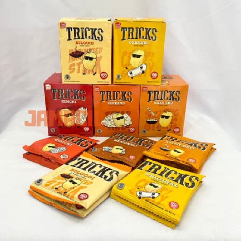 1 bungkus Tricks berisi 5 keping keripik kentang gurih dengan 5 pilihan rasa yaitu Original, Bulgogi, Kimchi, Asian BBQ dan Rendang