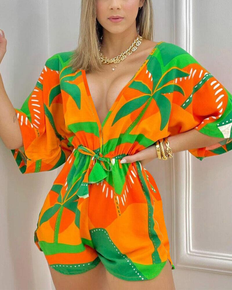 Tropical Print Drawstring Deep V-Neck Romper, Multicolor
