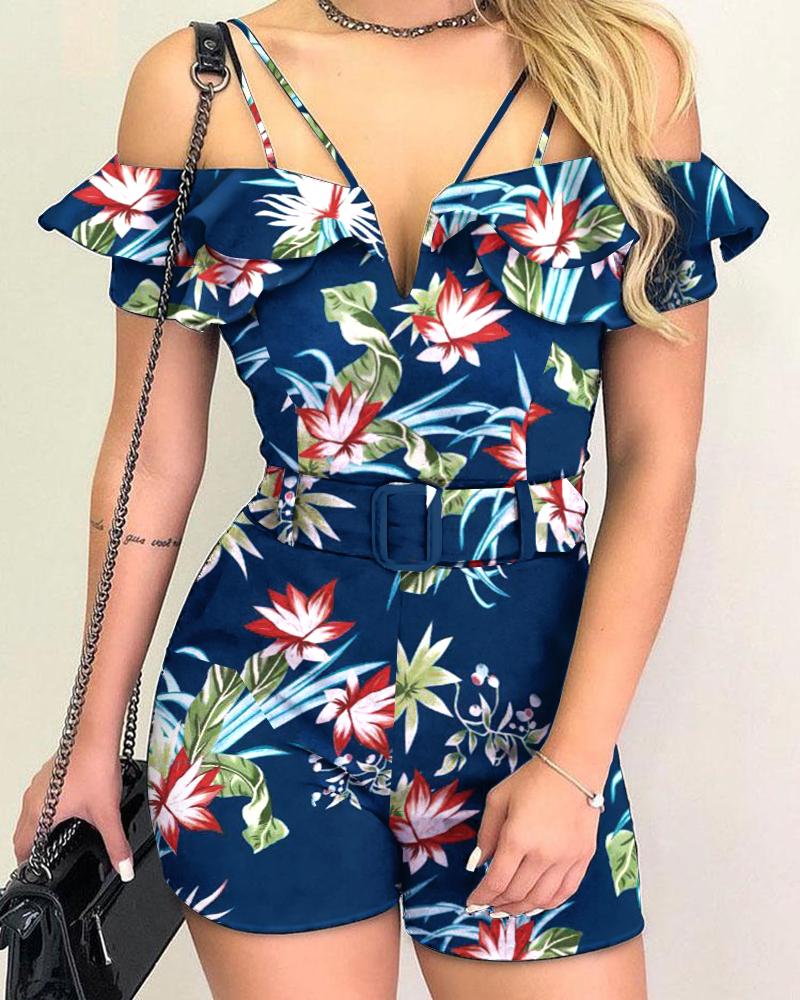 Tropical Print Ruffle Hem Cold Shoulder Belted Romper, Blue