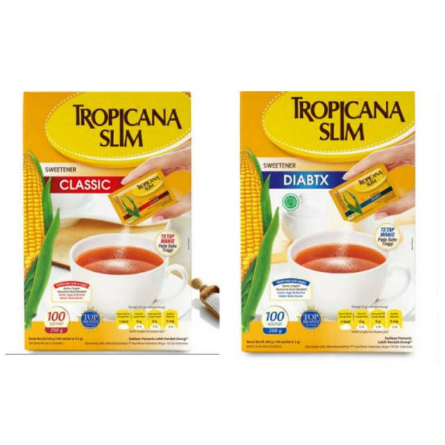 1 sachet (2,5 gr) Tropicana Slim Classic mengandung 5 kkal kalori yg setara dengan 2 sendok teh gula pasir yg