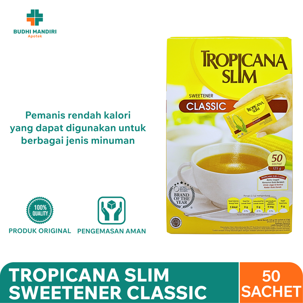 Tropicana Slim Sweetener Classic merupakan produk pemanis buatan yang mengandung kalori rendah sehingga aman dikonsumsi oleh penderita diabetes. Rasa manis yang terdapat pada produk ini tidak berbahaya sehingga tidak juga meningkatkan resiko terjadinya diabetes atau gula darah. Tropicana Slim Sweetener cocok digunakan untuk berbagai minuman seperti kopi, teh, jus dan minuman lainnya.
