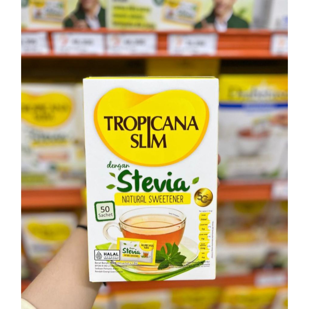 Tropicana Slim Stevia merupakan salah satu produk terbaru dari Tropicana Slim. Anda dapat merasakan manisnya Tropicana Slim Stevia yang berasal dari tanaman Stevia yang sudah sering digunakan sebagai gula rendah kalori di Jepang. Selain bebas gula produk ini juga nol kalori sehingga cocok dikonsumsi untuk mendukung program diet rendah kalori Anda dan mencegah penyakit diabetes. Dengan kandungan nol kalori, Tropicana Slim Stevia ini dapat memberikan rasa manis yang sehat untuk berbagai jenis minuman Anda Mengapa Tropicana Slim Stevia? - Bebas gula dan nol kalori, yang akan membantu kamu mengontrol asupan gula harian - Rasa manisnya aman untuk pola diet rendah gula dan juga penderita diabetes - Rasa manis enak, seperti gula pasir biasa Cara Penyajian dan Petunjuk Konsumsi : Tambahkan 1-2 sachet Tropicana Slim Stevia sebagai pengganti gula pasir, dalam minuman Anda. 1 sachet (2.5 gram) Tropicana Slim Stevia setara dengan 2 sendok teh (10 gram) gula pasir.
