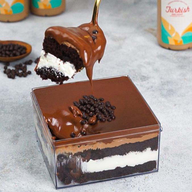 Buttercake coklat dilapisi dengan mousse cokelat dan vanila. Ditambah dengan lelehan cokelat turkish dan bola-bola coklat cripsy.