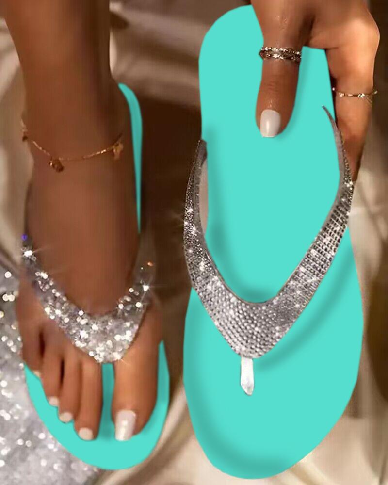Turquoise Color Rhinestone Strap Flip Flops, Turquoise blue