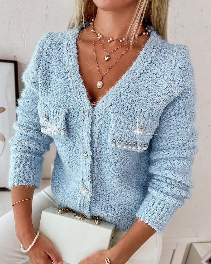 Tweed Rhinestone Pearls Decor Cardigan, Blue