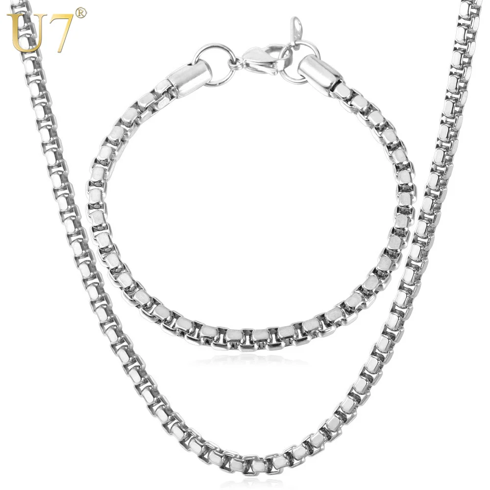 U7 Stainless Steel Jewelry Set For Women /Men Jewelry Fashion Never Fade 5MM Box Link Chain Bracelet Necklace Set Party S669