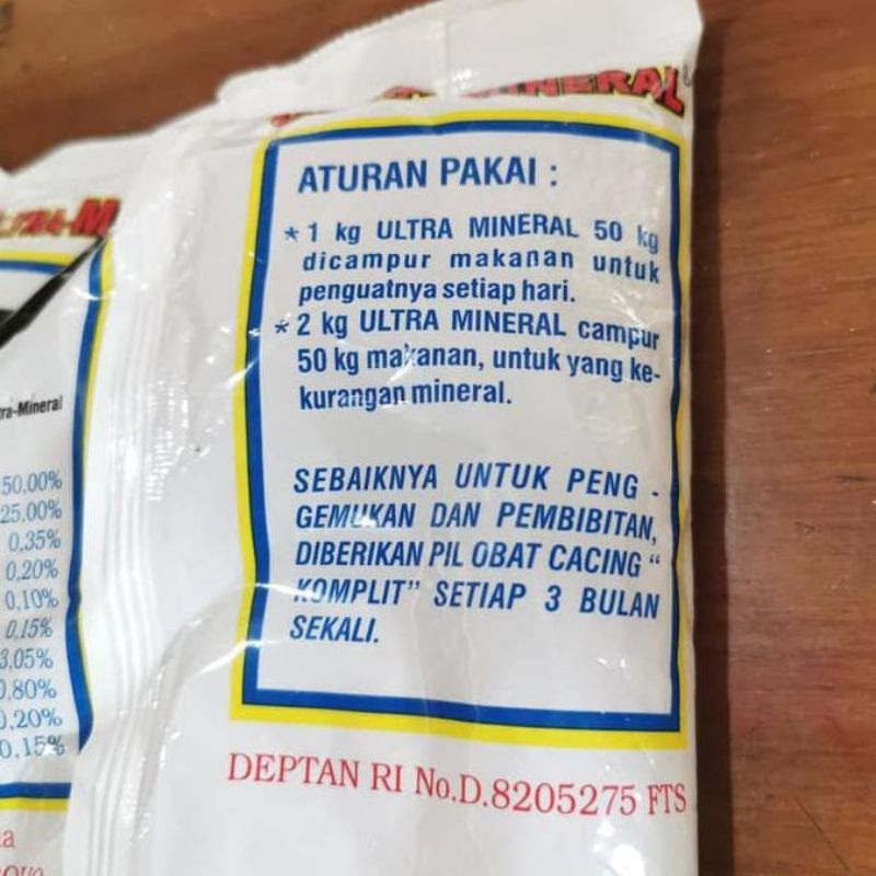 Mineral Premix Khusus untuk sapi perah, sapi potong. Sapi karapan, kambing dan domba. Sangat bermanfaat untuk: Sapi, kambing, domba yg sedang bunting/menyusui, agar anak yg dilahirkan lebih sehat dan kuat, produksi susu induknya dapat optimal dan tetap sehat. *Sapi Kereman (penggemukan) Agar pertumbuhan cepat besar, sehat, lebih gemuk & tidak mudah terserang penyakit. *Sapi Perah -Memperbanyak produksi air susu -Mencegah kelumpuhan -Mencegah keguguran(abortus) -Anak yg dilahirkan tidak cacat -Mencegah kebiasaan menjilat-jilat kandang ATURAN PAKAI: - 1 Kg Ultra Mineral 50 Kg dicampur makanan untuk penguatnya setiap hari. - 2 Kg Ultra Mineral campur 50 Kg makanan untuk yg kekurangan mineral. Sebaiknya untuk penggemukan dan pembibitan. Dibantu dengan pemberian pil obat cacing komplit setiap 3 bulan sekali.