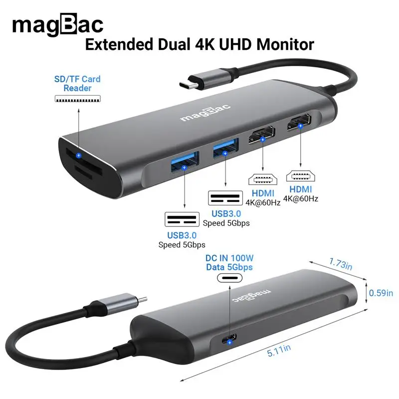 USB-концентратор magBac с двойным HDMI, 4K, 60 Гц, разные порты, 2 монитора, док-станция PD, 100 Вт, концентратор USB3.0 для Macbook Pro, HP, ASUS, DELL