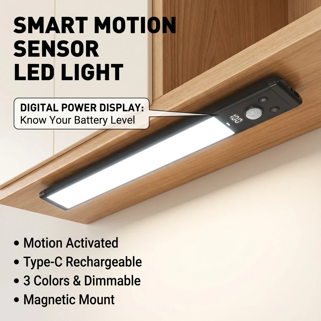 Ultra-thin Motion Sensor LED Under Cabinet Light with Digital Battery Display, USB Rechargeable Magnetic Closet Lamp Kitchen