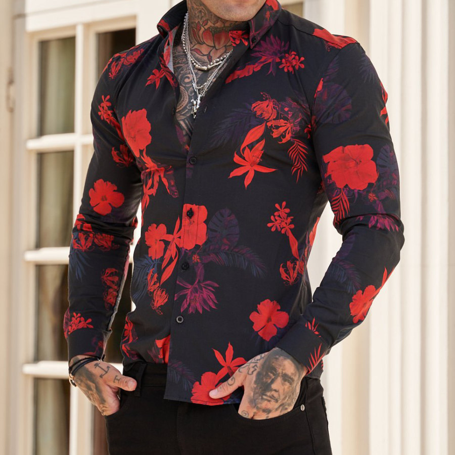 button-downs,ultra-thin stretch black and red floral print long-sleeved shirt