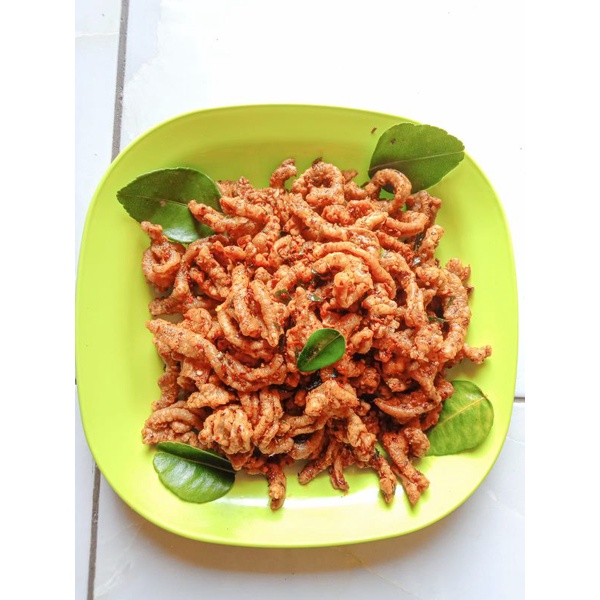 Cemilan renyah dan gurih yang merupakan olahan usus ayam dengan tambahan tepung dan rempah diolah dengan bahan berkualitas kemudian di tambahkan bumbu bumbu perpaduan Chili Pil dan daun jeruk sehingga menghasilkan cemilan yang renyah, gurih, bergizi dan kaya rasa