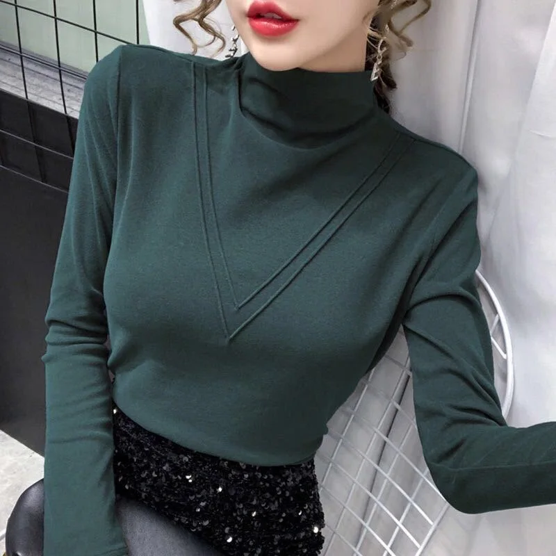 V-образный вырез подчеркивает красивую грудь, двусторонняя плюс бархатная теплая немецкая бархатная футболка с полувысоким воротником для ...