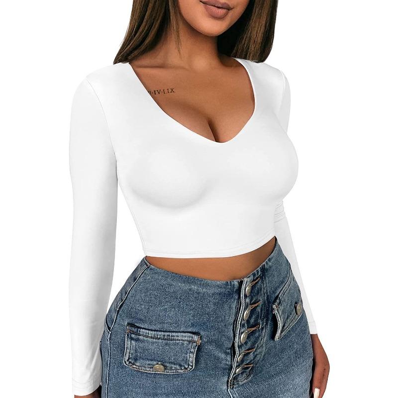 V-образный вырез с длинным рукавом трикотажные колготки короткий топ сексуальный V-образный вырез на груди однотонные колготки M белый