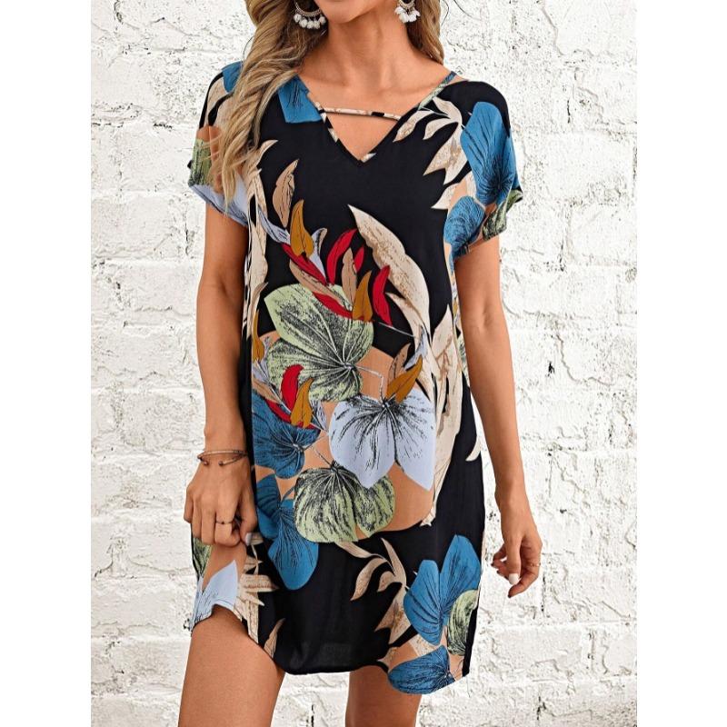 V-образный вырез с коротким рукавом А-силуэта летнее платье женское модное элегантное принтовое свободное повседневное платье женское винтажное платье больших размеров простое пляжное платье для отдыха 2680 XXL чёрный