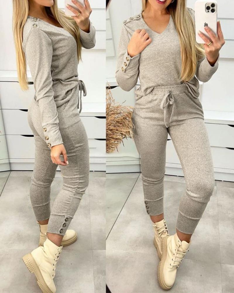 V-Neck Buttoned Top & Drawstring Pants Set, Apricot