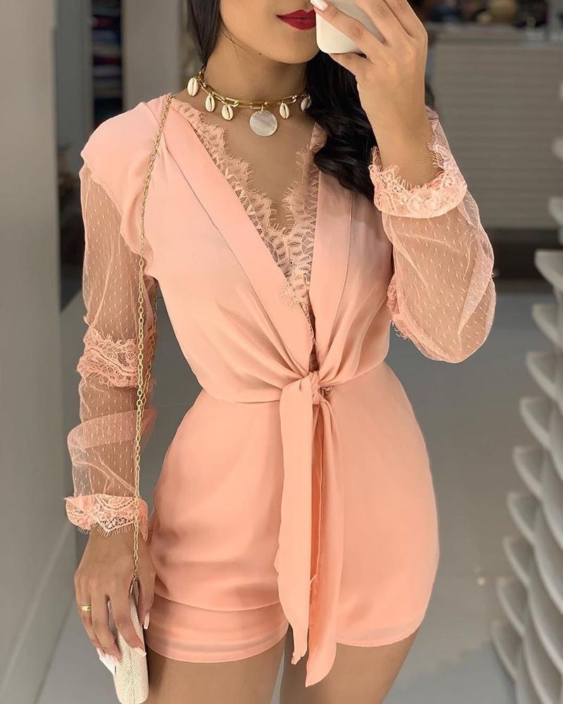 V-Neck Eyelash Lace Insert Twisted Design Romper