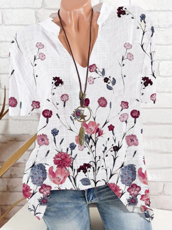V Neck Floral Print Short Sleeve Blouse