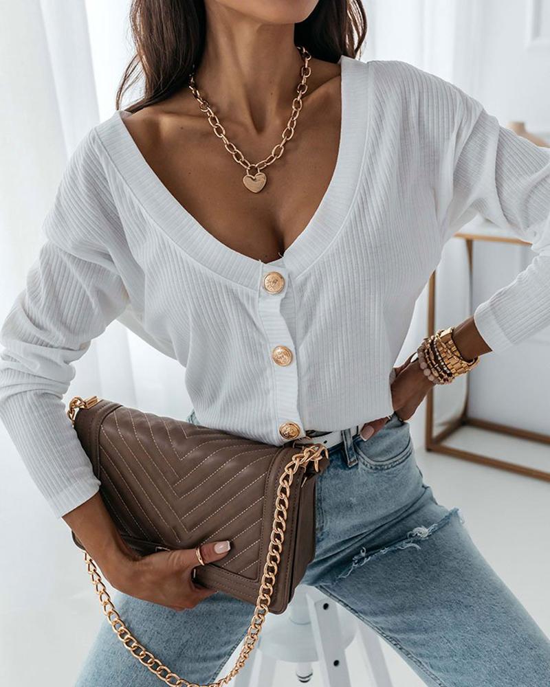 V Neck Long Sleeve Ribbed Buttoned Cardigan, White