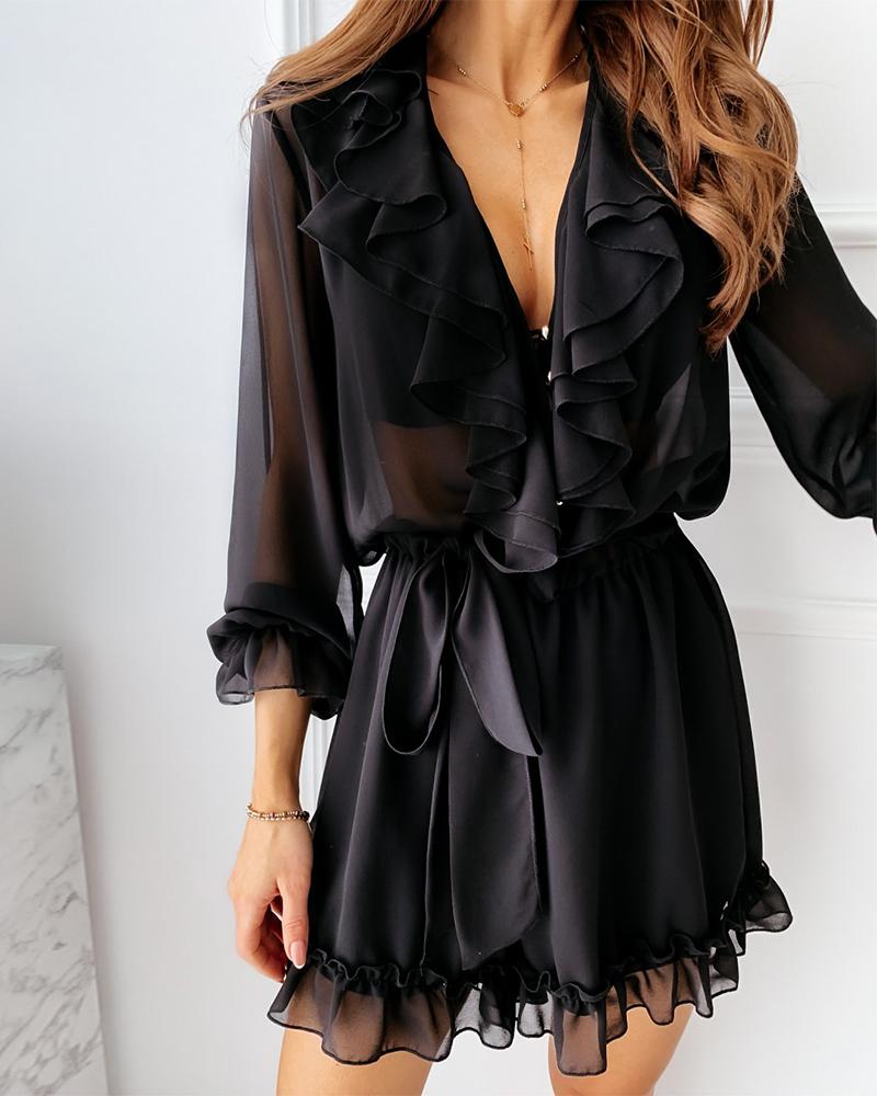V Neck Ruffle Trim Mesh Romper, Black