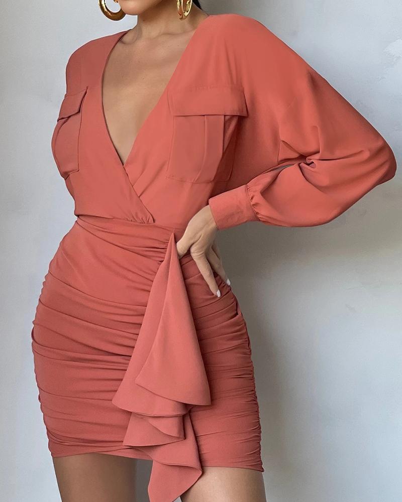 V-Neck Ruffles Ruched Zipper Pocket Bodycon Dress, Red