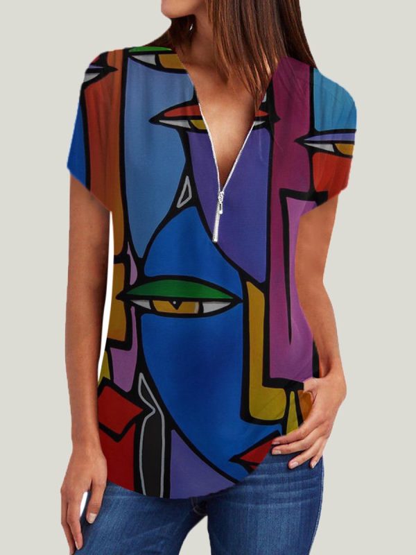 V-Neck Zips Print Roll-Up Sleeve Short Sleeve Blouse