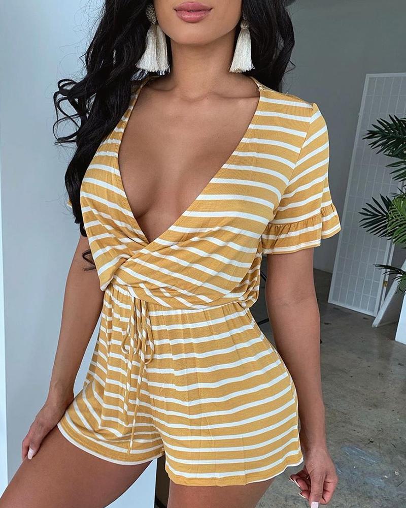 V-neck Ruffles Striped Romper, Yellow