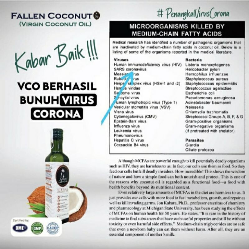 - Kandungan asam laurat pada minyak kelapa murni ( VCO) sangat tinggi, yaitu mencapai 52 %, sehingga sangat efektif untuk melawan bakteri, virus pada tubuh dan sebagai antibiotik yang alami.