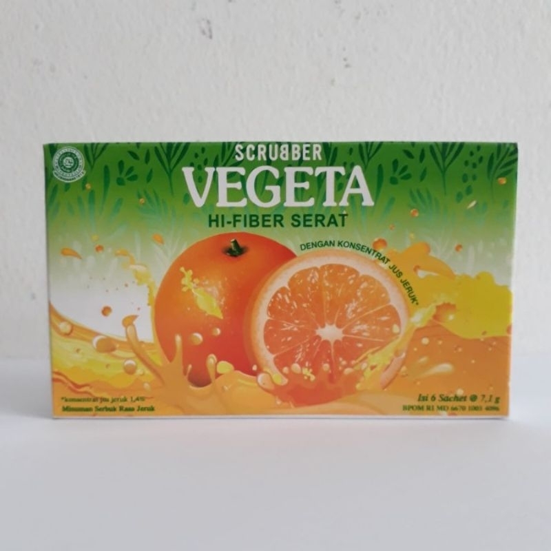 Deskripsi : Vegeta Scubber merupakan minuman berserat tinggi dengan konsentrat jeruk yang bermanfaat untuk membantu memenuhi kebutuhan serat harian | Komposisi : Tiap sachet mengandung Psyllium 7%, konsentrat sari buah jeruk 1.4%, Gula, Polidekstrosa, pengatur keasaman, perisa alami, penstabil dipati fosfat, antikempal, pemanis buatan (Aspartam dan Asesulfam-K), Oligosakarida, Garam, Penstabil Nabati, Pewarna (Kuning FCF CI 15985 dan Tartrazin CI 19140) | Dosis : - | Indikasi : Untuk membantu memenuhi kebutuhan serat harian | Perhatian Khusus : 1. Mengandung fenilalanin sehingga tidak cocok untuk penderita fenilketourik