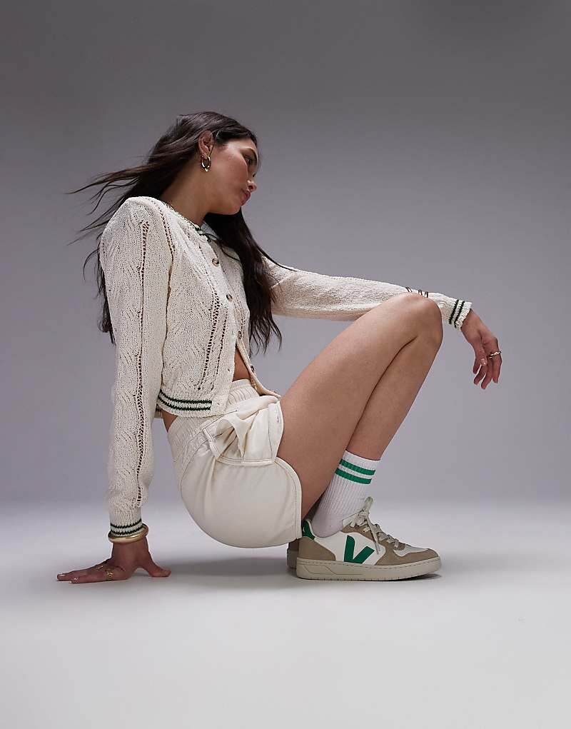 VEJA – V-10 – Белые кожаные кроссовки с бежевыми и зелеными вставками, Зеленый, VEJA – V-10 – Белые кожаные кроссовки с бежевыми и зелеными вставками