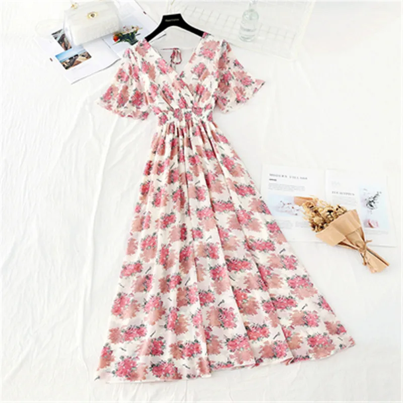 Women Ruffle sleeve Ruffles V-neck Chiffon summer Dress 2020 Short sleeve Floral print long dress Slim High Waist Vestidos 196