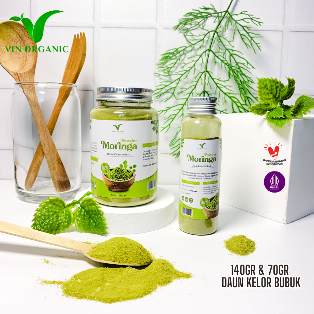 Moringa (kelor) Powder adalah daun kelor asli yang sudah diolah menjadi bubuk. Daun kelor sendiri sudah sering dimanfaatkan untuk pengobatan tradisional karena manfaatnya yang baik untuk kesehatan. Daun kelor memiliki kandungan lebih dari 40 antioksidan dan 90 jenis nutrisi penting seperti vitamin, mineral, asam amino, antioksidan, anti penuaan dan anti inflamasi.