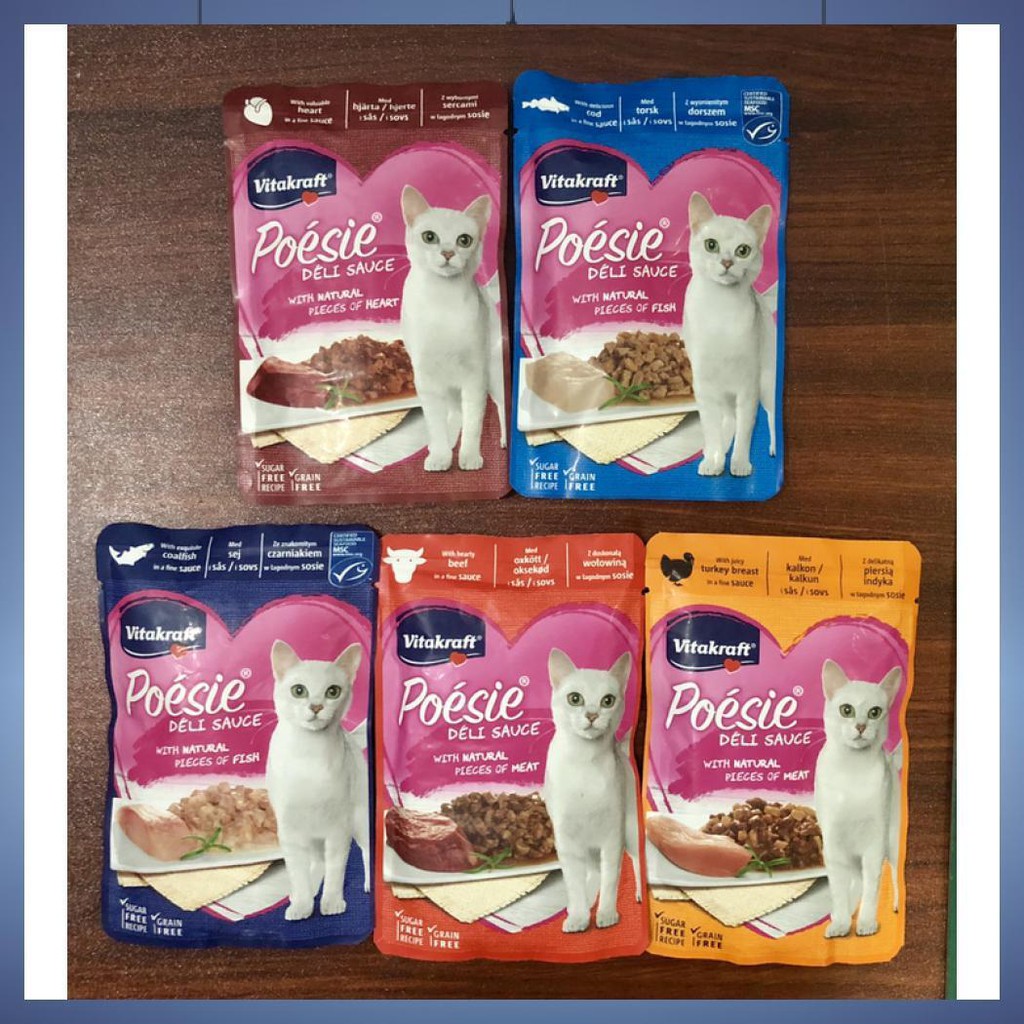 Vitakraft poesie in deli sauce, isi bersih 85gr, tersedia dalam 5 rasa: