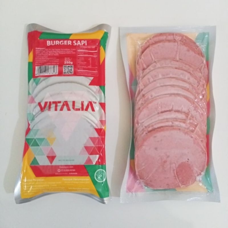 Vitalia Burger Sapi /ayam ini merupakan daging olahan yang biasa dipakai sebagai isi roti burger dan berasa dagingnya. Terbuat dari daging giling pilihan disertai paduan bumbu yang menjadikan rasanya enak dan cocok di lidah.