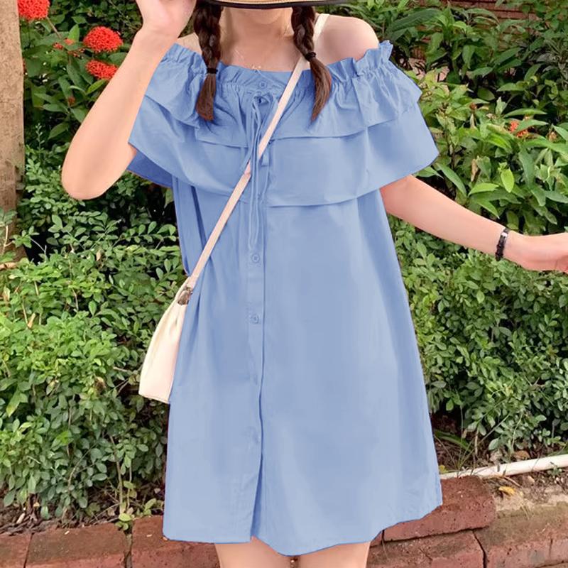 VONDA Женские летние однотонные платья А-силуэта с открытыми плечами и короткими рукавами с оборками 5XL синий