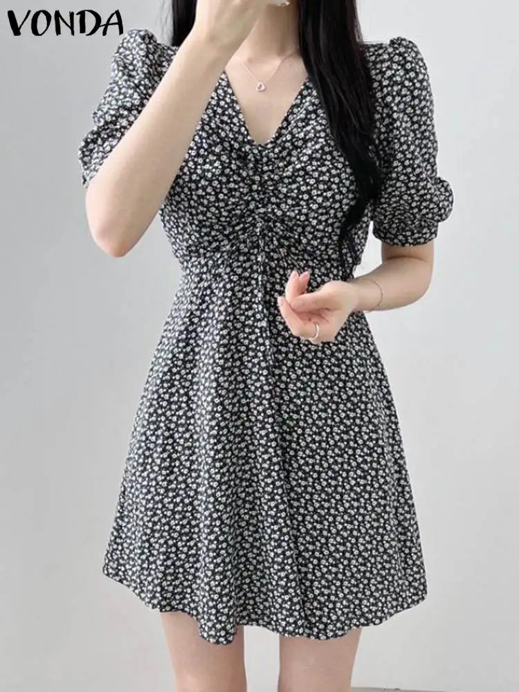 VONDA Y2K элегантное модное женское Плиссированное праздничное платье с цветочным принтом, короткая туника, женское платье с коротким рукавом ...