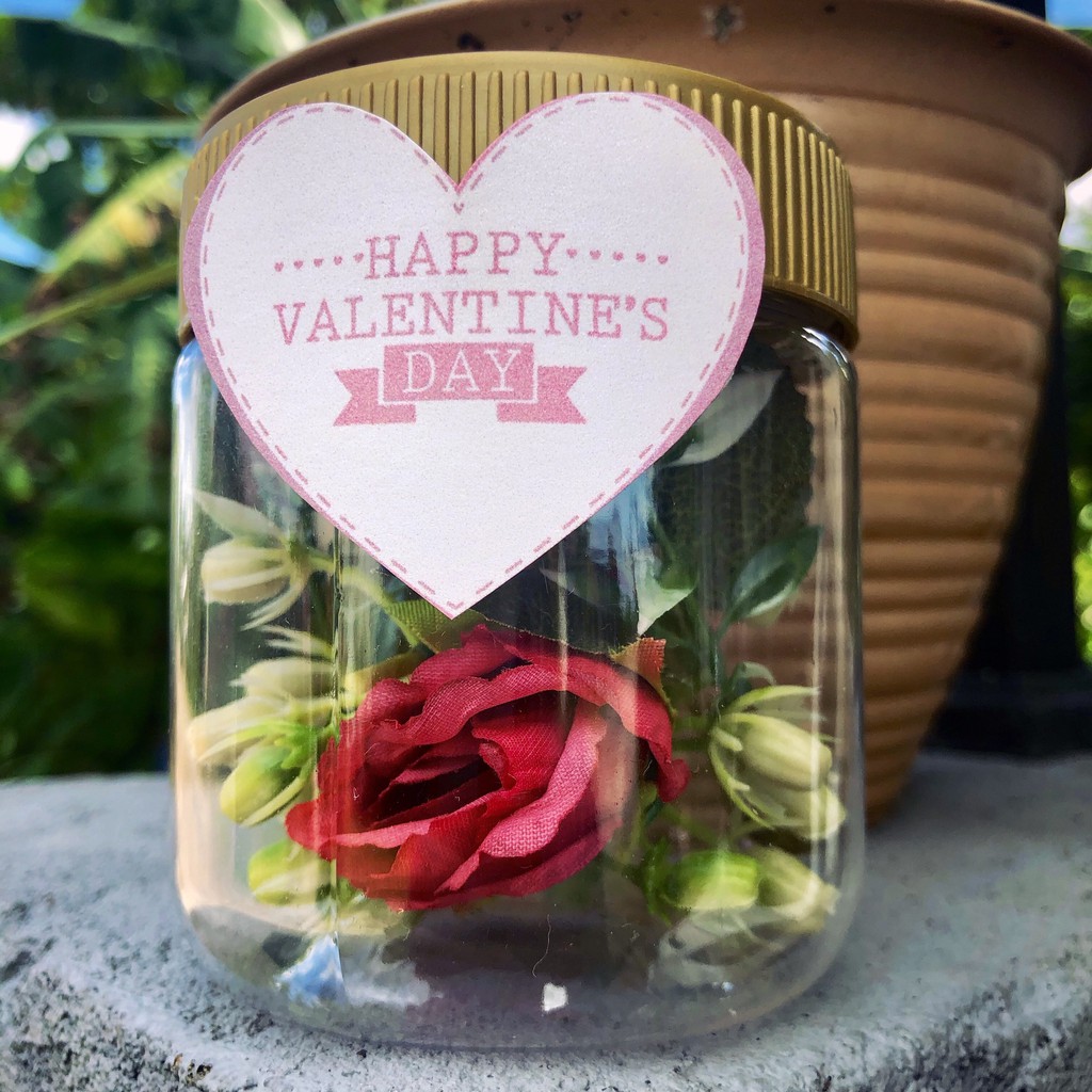 Transparent jar berisi dekorasi bunga mawar merah yang cantik