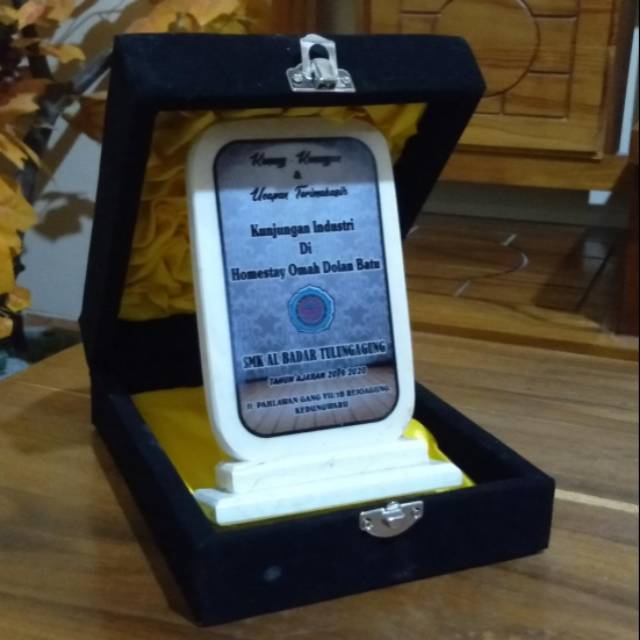 Terbuat dari batu marmer yang dikenal mudah dibersihkan dan berkilau. Plakat marmer cocok digunakan sebagai bingkisan event, dengan sifat semi formal mampu memberi kesan penghormatan kepada penerima. Namun selain itu dengan memainkan design, plakat marmer mampu menjadi solusi hadiah kepada teman sebaya.