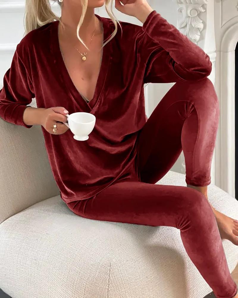 Velvet Deep V-Neck Top & Pants Set, Red