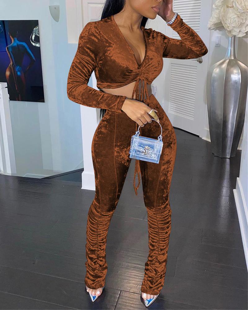 Velvet Drawstring Ruched Crop Top & Stacked Pants Set, Brown