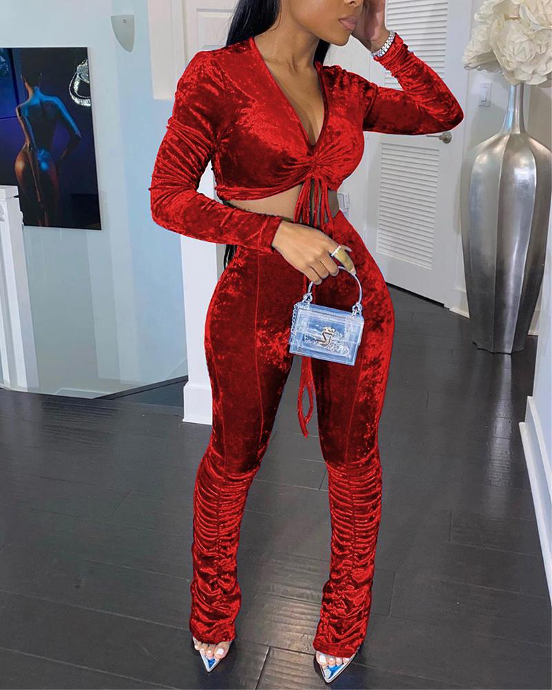 Velvet Drawstring Ruched Crop Top & Stacked Pants Set, Red