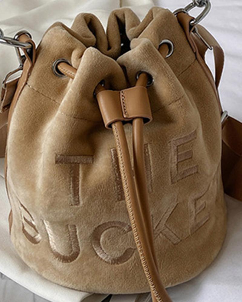 Velvet Letter Pattern Drawstring Bucket Bag, Khaki