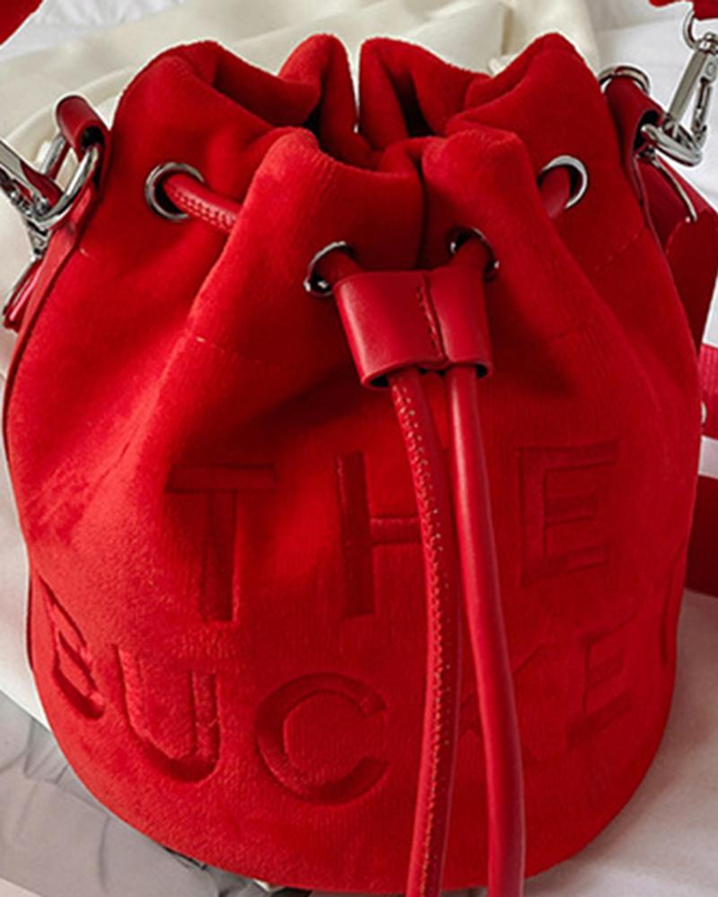 Velvet Letter Pattern Drawstring Bucket Bag, Red