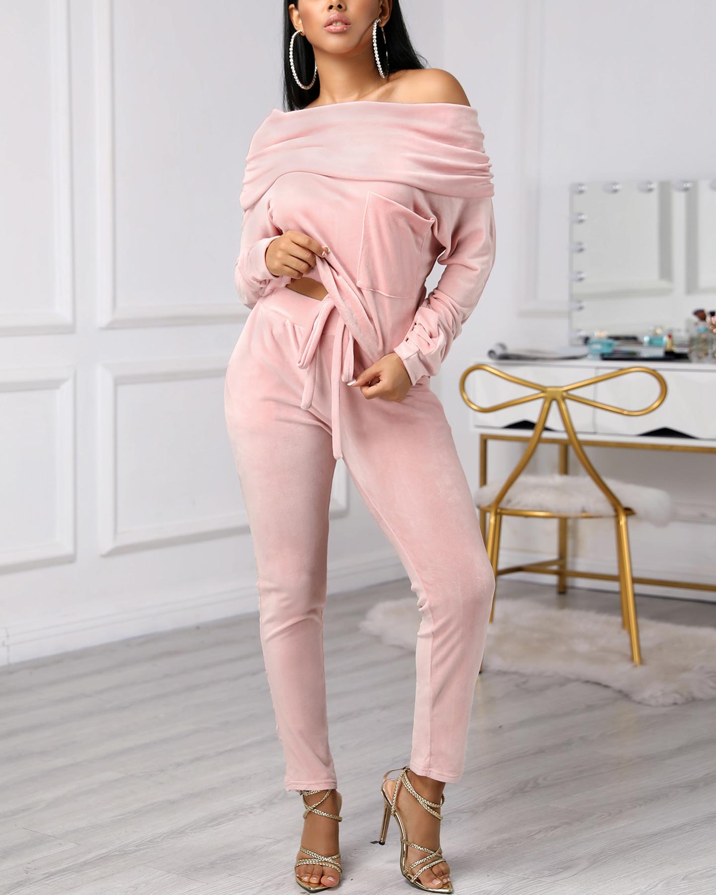 Velvet Off Shoulder Ruched Top & Drawstring Pant Sets, Pink